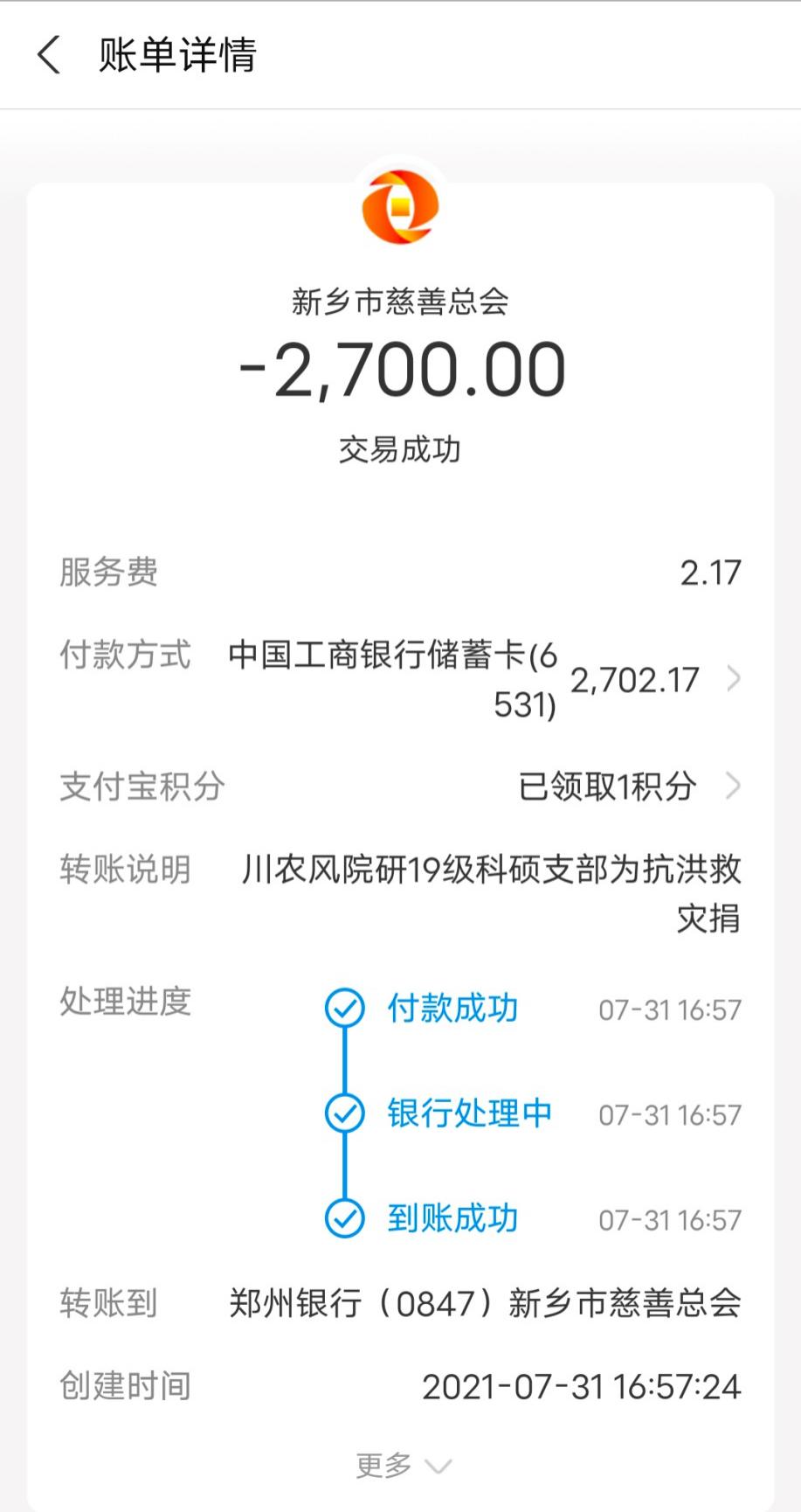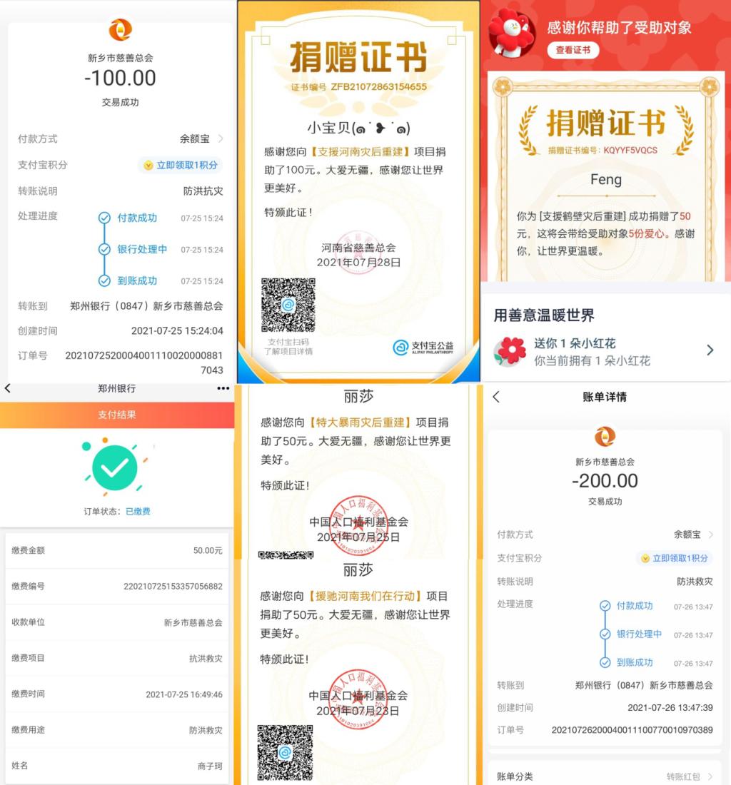 据悉,该支部此前已积极号召并组织该院19级专硕支部与20级支部进行线上募捐,此外该支部将获评校”优秀基层党支部”所得部分奖金用于助力新乡灾后重建。截止7月31日,该支部通过募捐、义卖等形式共筹得4500元,除线上自发捐款由支部同学各自捐出外,其余所得款项2700元统一捐赠给河南新乡市慈善总会用于抗洪救灾。