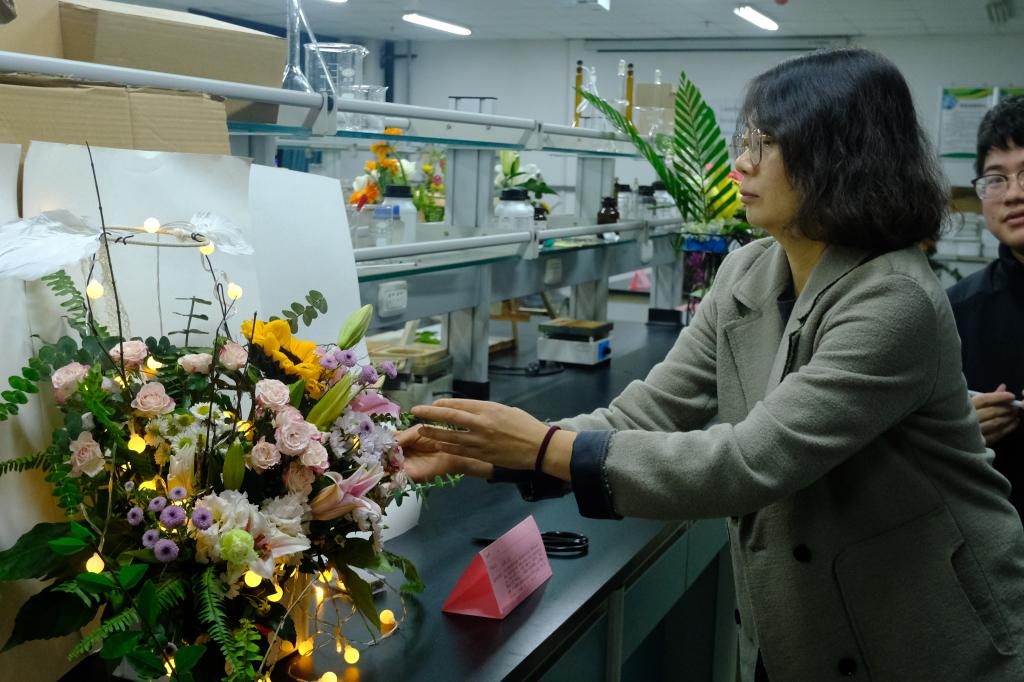 所有完成的作品整齐陈列在实验室中,由专业课教师潘远智教授、江明艳教授、姜贝贝教授进行现场评分。评委老们从作品完成度,色彩搭配,花材形态,创意及作品内涵等方面对参赛作品进行了点评。20个小组的参赛作品脱颖而出,这些花艺作品将在11月2到4日于成都校区图书馆进行展览和微信线上大众投票。评委老师分数和大众投票分数将按比例进行折算,最后决选出入围决赛的15支队伍。