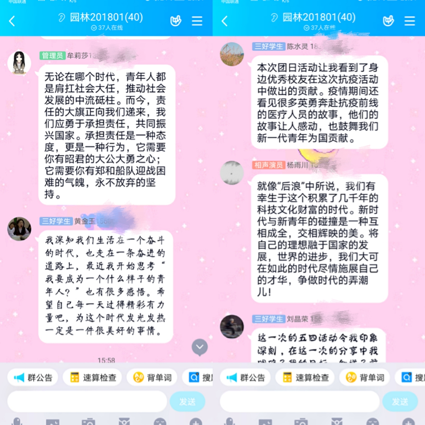 为带领支部青年传承五四精神,发扬抗疫时中华民族的“敢于担当”的精神品质,让青春在最美的地方绽放,5月5日下午15点,园林1801团支部于线上顺利开展“追忆五四魂,弄潮新时代”主题团日活动。