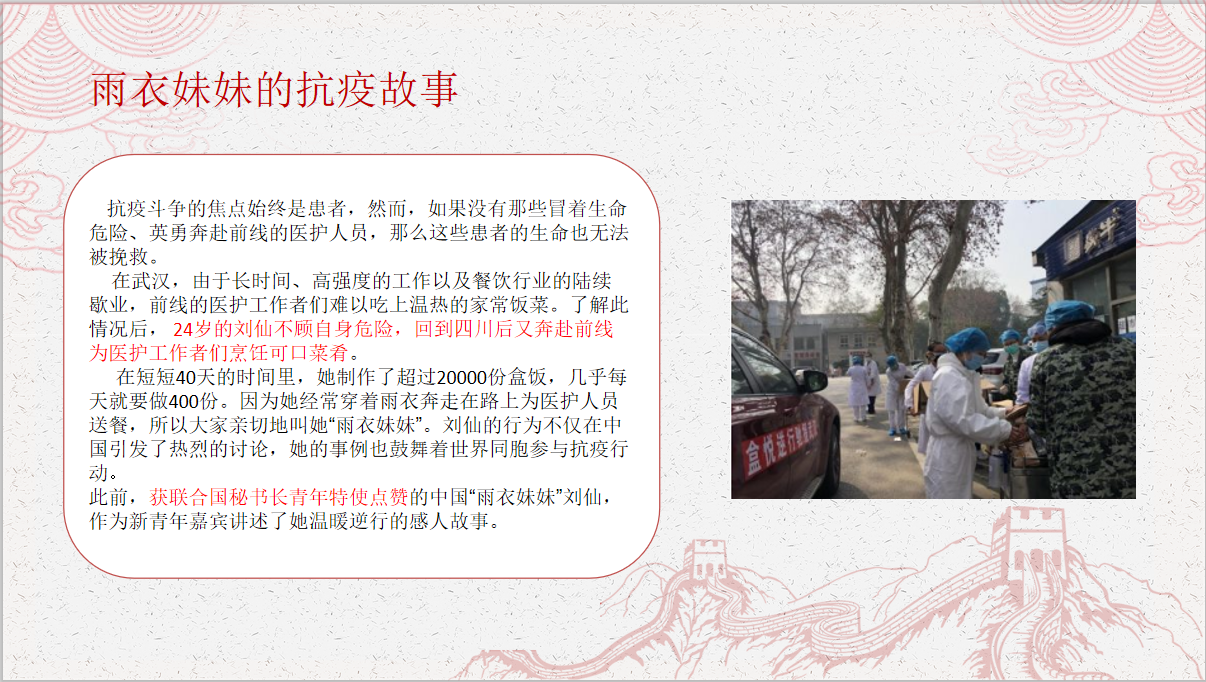 在本次团日活动的主题微团课中,团支书组织同学了解学习“雨衣妹妹”的抗疫故事,带动大家共同探讨新时代新青年的责任担当,一起学习优良品质。“她是一个很优秀、很值得我们学习的人。”该班员工牟莉莎如是说,“她代表了极大部分青年的品质,作为新时代的新青年,我们就是要有这样无私奉献的爱国精神。”