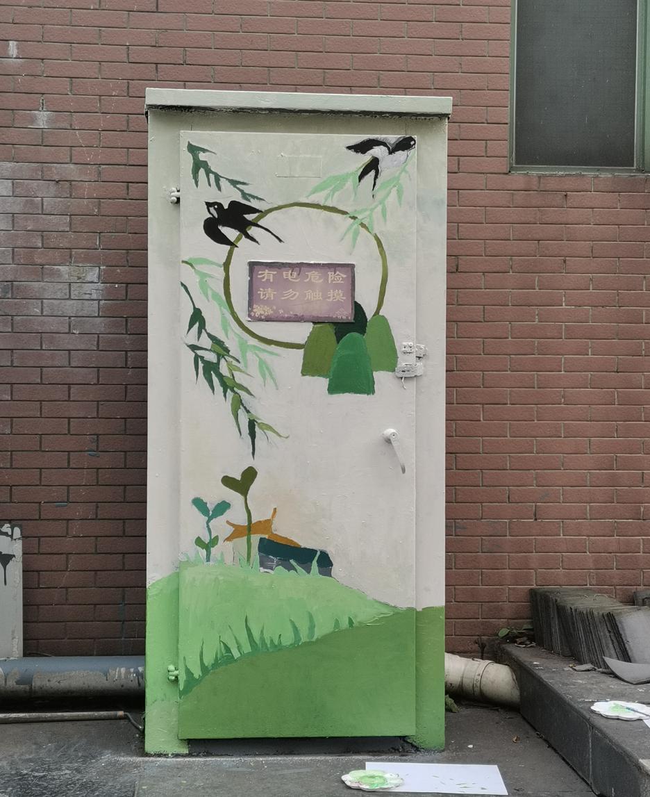 两个半小时后,原本浑身上下“一灰到底”的电箱终于穿上了新衣服,以绿色和白色为主的色调为这充满寒意的冬季带来了一丝春意。在经过一个上午的努力工作后,合作的双方志愿者们面对着面前的作品都露出了心满意足的笑容,社区的相关负责人也为大家竖起了大拇指。