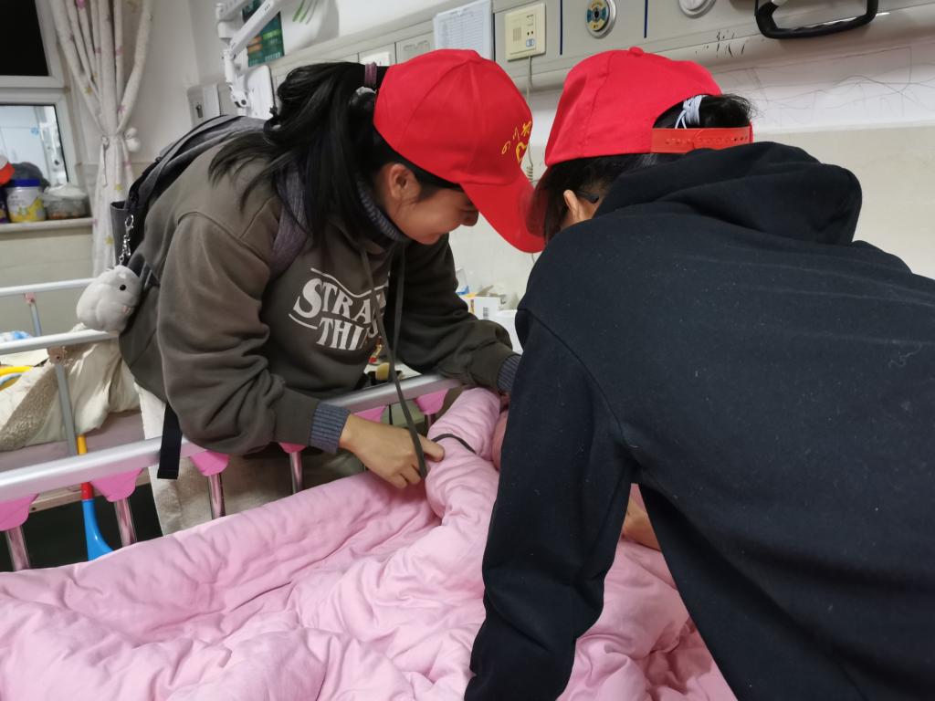 志愿者们选择了一些病房,和孩子家长说明了来意。看见志愿者们的到来,家长们略显疲惫的脸上也展现出喜悦的神色。在征得家长们的同意后志愿者们来到小朋友的床前,同家长了解孩子们的爱好,再根据孩子的爱好同他们进行“交流”。病房里响起孩子们喜欢的音乐,孩子们笑了,陪护家长们笑了,志愿者们也笑了。