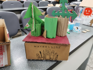 下午18:50,志愿者带着自己的材料陆续来到了活动教室,便热火朝天地开始了各自的制作过程。在活动现场可以看到,参加活动的志愿者们都十分心灵手巧,部分同学更可称得上专业,自己带来的工具比协会成员们提前准备的工具还多。有志愿者用一个稍大的纸盒做底,裁剪了合适大小的纸板作隔板,再在表面画了精美的图案,做出了既漂亮又非常具有实用性的收纳盒;也有志愿者从纸盒上裁剪了六个等大的正方形,做了一个储蓄罐,还在外表面包上了自己带来的酷酷的包装纸,整个作品看似简单,却是十分牢固而精巧;还有志愿者裁剪拼贴出了一个深受孩子们喜爱的奥特曼造型;更有甚者,凭借细致的刀刻技术和绘画技巧,做出了孩童们在公园的花草树木间玩耍的模型,令人惊叹……组织活动的协会志愿者们也一起合作,做成了一个收纳盒、一座房子和一辆吉普车。