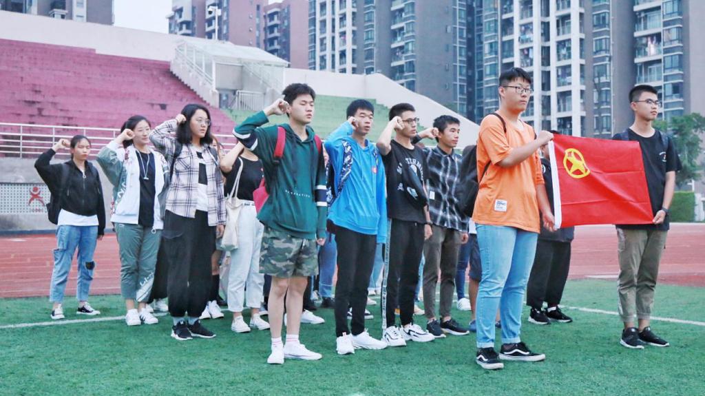 9月23日早上7点整,风景园林201901班全体团员在操场整队集合,全神贯注地注视着公司国旗护卫队升旗仪式。护旗手们踏步而来,穿着工整的军装,庄严肃穆地将国旗送上高空。“青春心向党,建功新时代”主题团日活动也正式拉开帷幕。