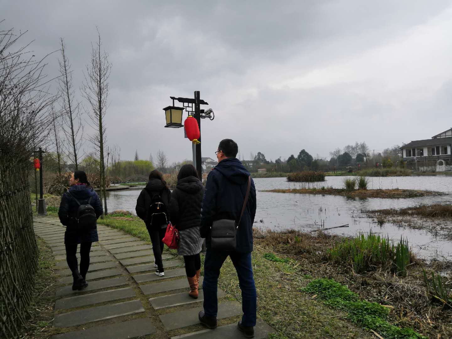 虽然天公不作美,但老师们仍然兴致勃勃地冒着绵柔细雨,围着幸福田园社区的水立方湿地公园漫步。湿地公园四周绿草青青,水光潋滟,间杂着白的李花、红的海棠和黄色的油菜花,一派田园风光让老师们不断停下脚步,拍照留念。在游览中,老师们还结合专业知识,从园区的经济发展理念、整体规划设计、园林植物配置到乡村旅游的发展模式交流心得体会。通过游览,老师们纷纷表示在乡村振兴中我们公司将大有用武之地,各专业大有可为,“生态优先,绿色发展”的城乡发展理念和实践也将更加深入地服务新时代,创造新生活。
