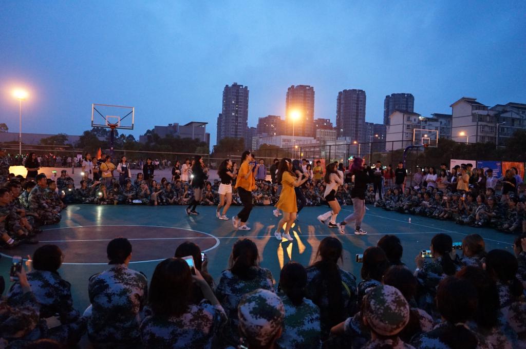 现场掌声不止,围成一圈的新生们呼声不断。拉拉队率先热舞开场,随后演唱队带来现下火热的歌曲串烧,逐一将大家的距离拉近。来自环境设计专业的沈同学迫不及待的向师兄师姐们传达爱意,高高竖起了大拇指。连教官们也放下了平时威严的面孔,跟着新生们一起娱乐。风景园林专业的李同学还分享了与教官发生的友爱故事:教官“欺骗”新生说自己是零零后,以拉近与新生们的距离;平时内敛严厉,但也会为新生买糖吃;嘴上无情,但是很留心新生的身体状况。