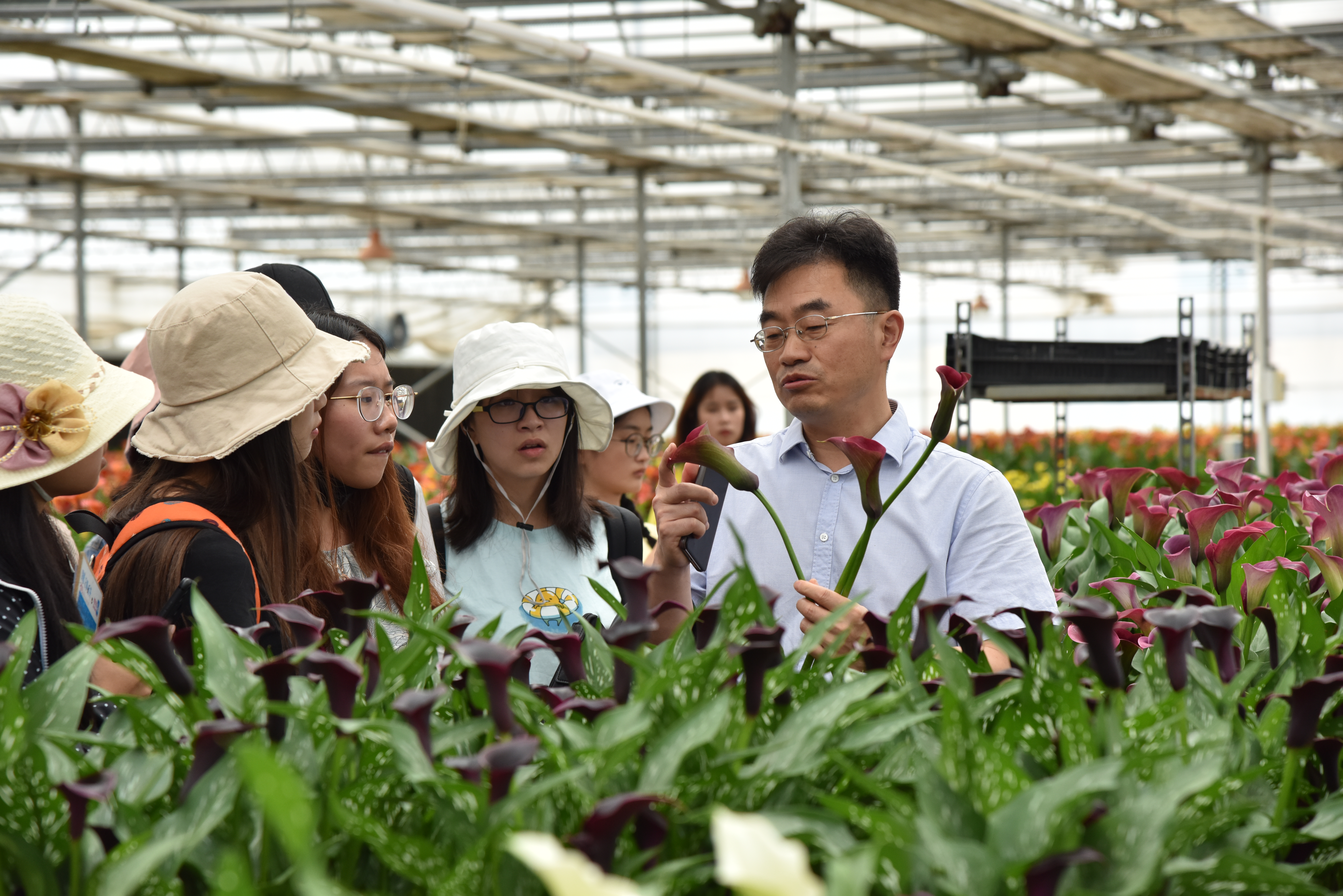 实习第四站——花卉生产企业。先后前往虹之华有限公司和昆明真善美兰业有限公司进行参观学习,了解了切花菊种苗和盆花马蹄莲的生产、采收、储藏及包装过程。公司副经理潘远智老师和园林专业负责人刘光立老师赶赴实习队伍,看望慰问大家,并带队讲解。图5