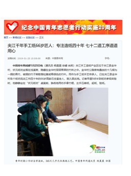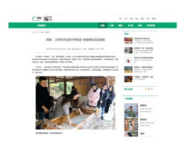 实践结束后,调研团队除了在教育部中国老员工在线发表了一篇新闻,还在中国青年网发表了一篇新闻,而且中青网的人物专访“夹江千年手工纸66岁匠人:专注造纸四十年七十二道工序道道用心”更是被选为中国青年网官网首页人物新闻。