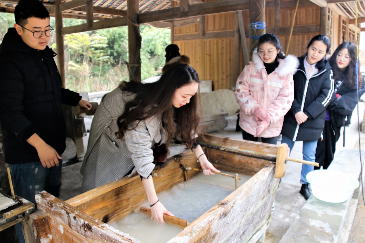 造纸术是中国的四大发明之一,传统手工造纸以手工操作为主,利用帘网框架,人工逐张抄制而成。四川夹江县金华村状元纸坊手工竹纸制作技艺更是被列入第一批国家级非物质文化遗产名录。调研团队到达状元纸坊后,非遗传承人杨宏伟先生首先给团队讲解了手工造纸的72道工序;又演示了“抄捞成纸”“捣制纸料”两道工序,并让每位队员亲身体验这两道工序。在体验过程中,其中一位队员说到:“我看传承人刚才给我们演示时,是如此的行云流水;而我自己操作时却完全不会,但是我明明感觉自己会了。”传承人杨宏伟先生告诉我们,只有数十年如一日的反复练习才能“行云流水。”看似普通的竹帘、竹床实则充满奥秘,每个细节之处都是匠心所在。