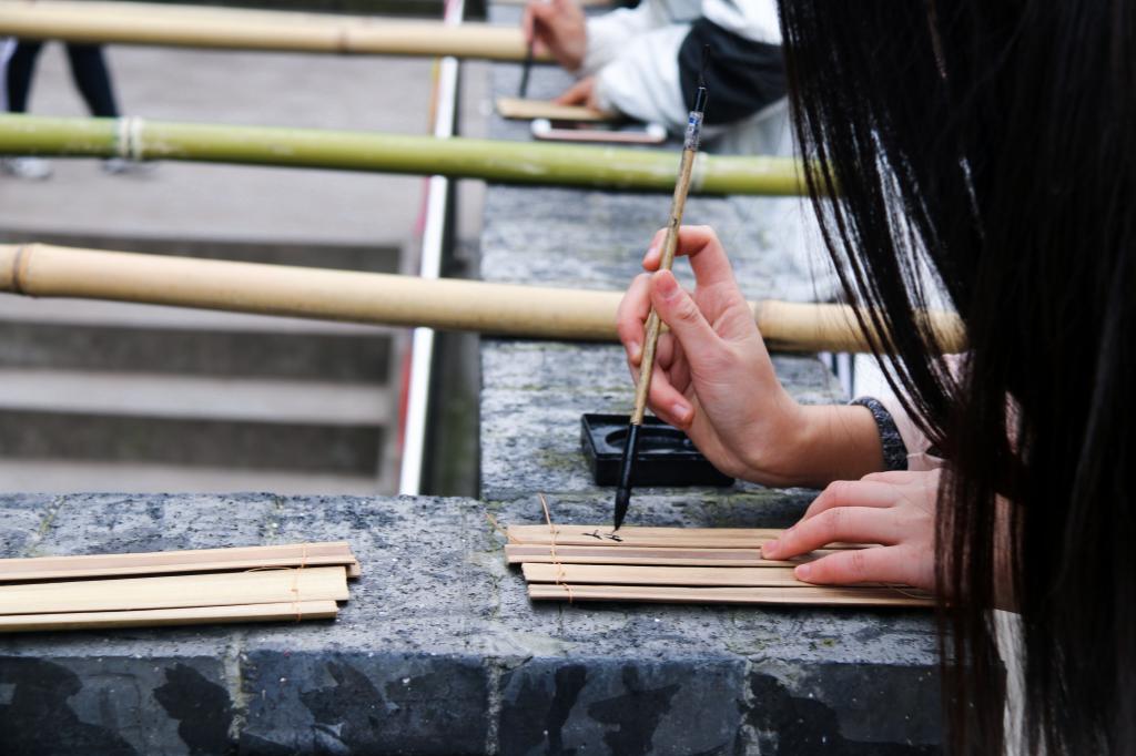 体验完这两道造纸工序后,实践团队又通过印刷年画、书写竹简两个活动来感受夹江纸的实用性。年画印刷所用的纸正是状元纸坊的手工纸,用手指摩挲纸面,还能感受到纸的平整和肌细。印刷年画时,先将需要的颜色均匀地刷在画版上,再将纸轻轻覆上,接着用刷子拂过整张纸面,一张工整清晰的年画便印刷完成了。夹江竹纸在印刷过程中不易破损,并且保留色彩的效果极佳。实践小组的成员们纷纷表示该过程十分便捷、有趣。书写竹简时,成员们认真对待自己编好的竹简,写上心中所想。一撇一捺间,是现代语言与古代书写工具的交融。尽管如此,他们仍表示纸的使用感受略胜一筹。