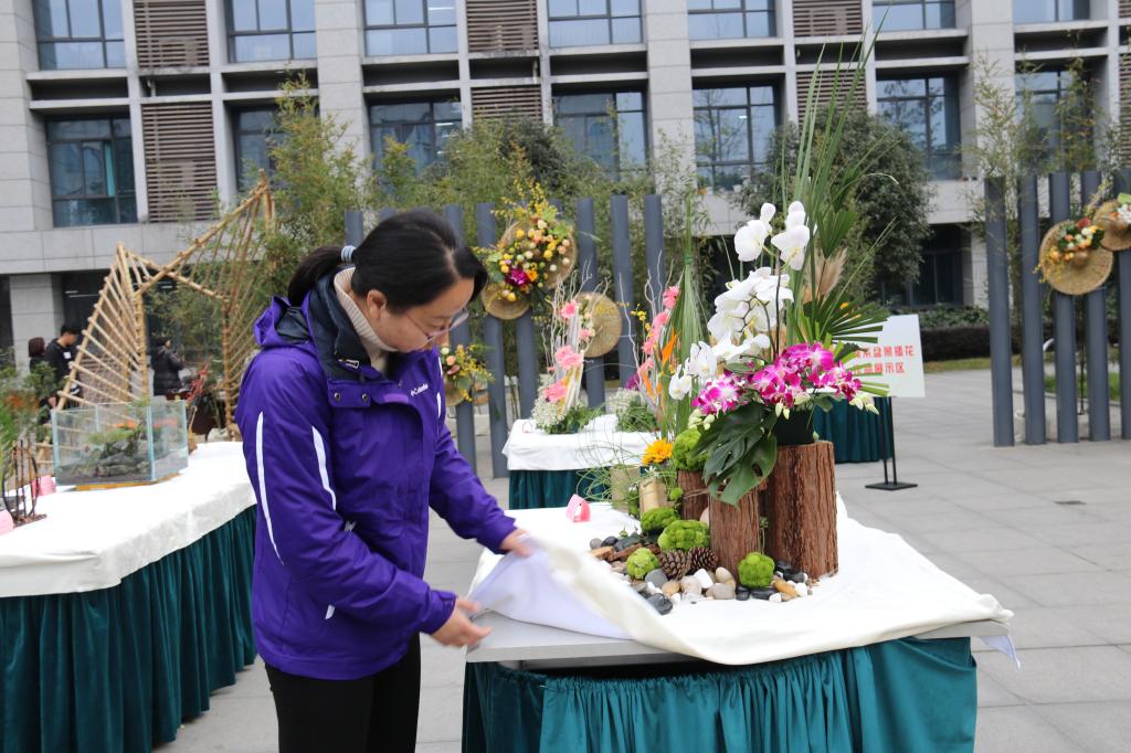 盆景插花以新鲜材料为主体,受环境影响大,且辅料又多杂,大大小小共计几百样。户外展示的挑战,既需要操练平时功,更需要临阵磨枪快。