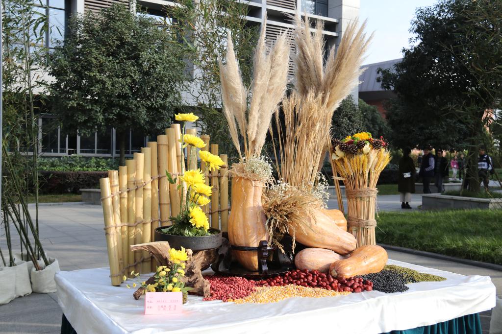 在制作作品的过程中也遇到各种挫折和困难;有一个小组的作品需要南瓜,但这个南瓜在尺寸,色泽,质感和形状方面要符合插花造型的设计,可是在公司附近的惠民菜市场买不到符合要求的大南瓜,于是小组的同学就分头行动到温江的所有菜市场去碰运气。可是同学们跑了一个又一个集市,询问了一家又一家蔬菜摊,也没买到想要的材料。那些卖家中,大部分一听购买南瓜的要求就不耐烦的说没有没有,甚至被指责不买菜就别挡道。一共跑了十多家菜市场,受了各种白眼,南瓜也没买到;在同学们筋疲力尽,有点心灰意冷的想要放弃的时候,一位热心大婶提议他们去航天路菜市场碰碰运气,功夫不负有心人,同学们终于在航天路菜市场买到了心仪的南瓜,并在老师的指导下创造了一个更完美的构思。但是新的问题却来临:材料不够!除了南瓜之外还需要购买玉米、小麦、水稻等具有川农专业特色的材料来表现丰收的主题,于是小组的同学们又紧急分配任务,继续寻找符合作品要求的材料;虽然过程很累,但小组的同学彼此鼓励,共同坚持,团队的力量果然强大;最后,当一个完整的作品出现在眼前时,成功的喜悦洋溢在同学们的脸上,大家感到特有成就感。最后大家商量,一致决定将作品命名为:满眼丰收意,一腔川农情。同学们深感在川农不仅收获了知识和文化,更收获了人生的成长与历练,通过作品的制作更让同学们体会到了“爱国敬业、艰苦奋斗、团结拼搏,求实创新”的川农大精神!