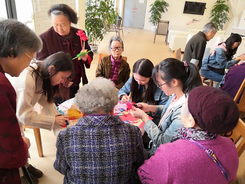 临时教室——敬老院大厅里,讲解的志愿者与折纸的老人们一直在开心地交流折纸方法。折纸过程中,志愿者们为老人一步一步地讲解操作,老人们也认真学习,一有不懂的地方就询问志愿者。通过一段时间的练习,老人们渐渐掌握了技巧,折起纸来也比刚开始时顺手了。