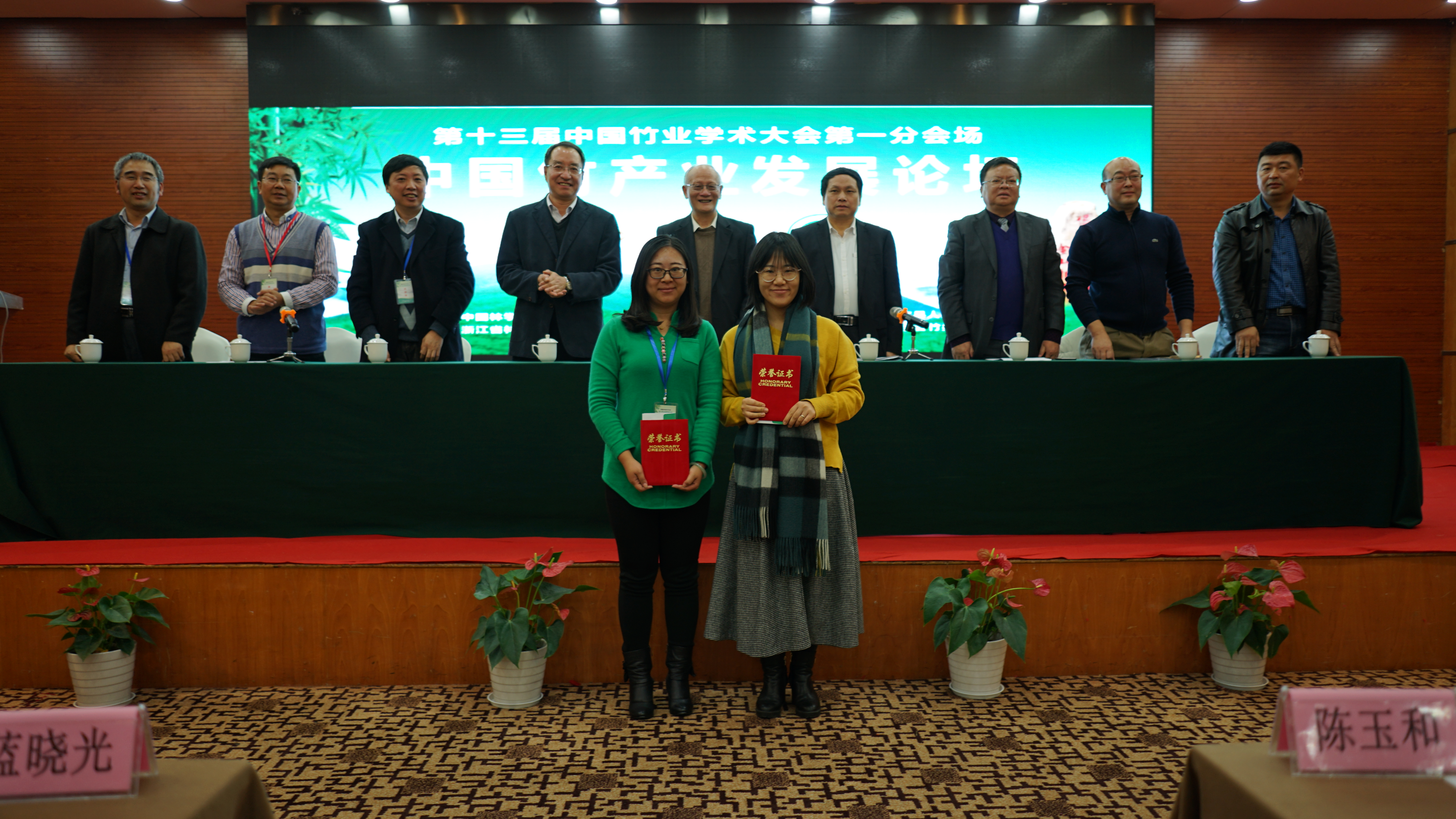 本次大会有来自国家林业局、浙江省林业厅、中国林学会、中国林科院、各省市林业部门、科研院校等主管部门领导、专家学者、市县乡竹业技术员、竹业企业家400余人参加。竹业学术大会共收到论文126篇,江明艳副教授论文获得大会论文一等奖(共两名),林葳博士论文获得优秀奖。