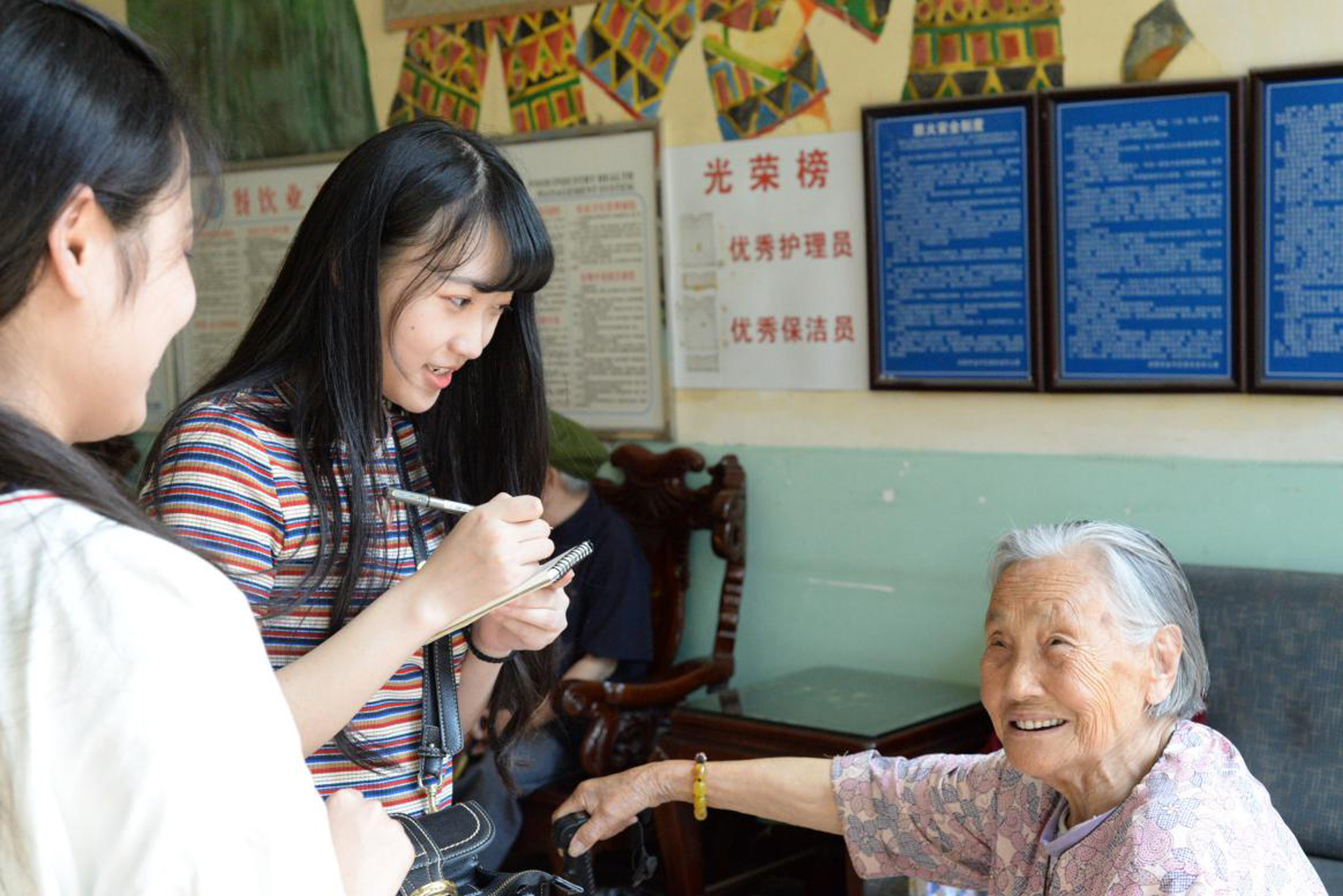 大厅中川农学子正在采访一位老人------梁诗垚摄