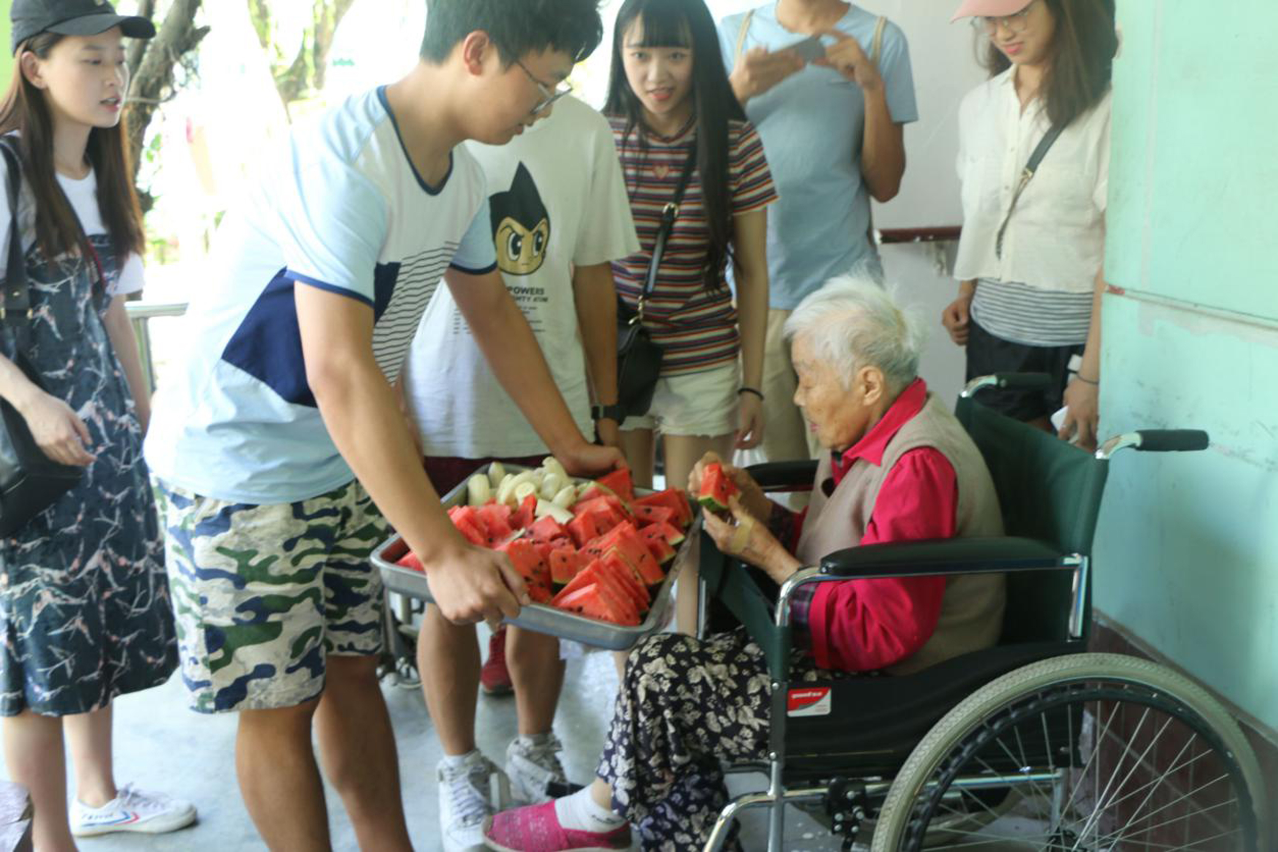 川农学子们为老人们送上水---梁诗垚摄
