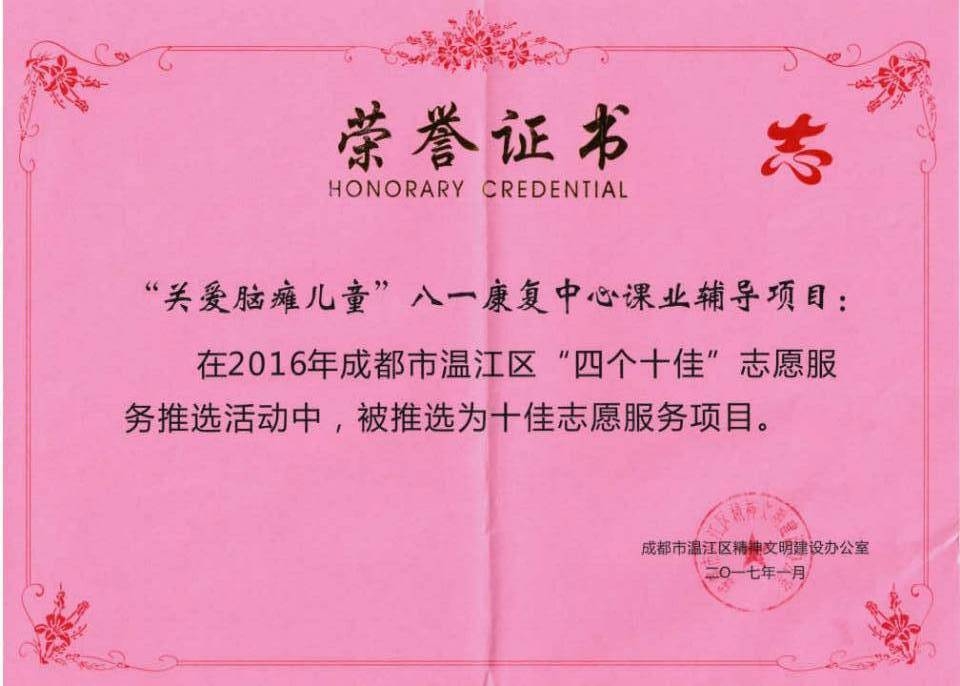 2017年3月3日,K1体育青年志愿者协会的“关爱脑瘫儿童”八一康复中心课业辅导活动获得温江区十佳志愿服务项目称号。