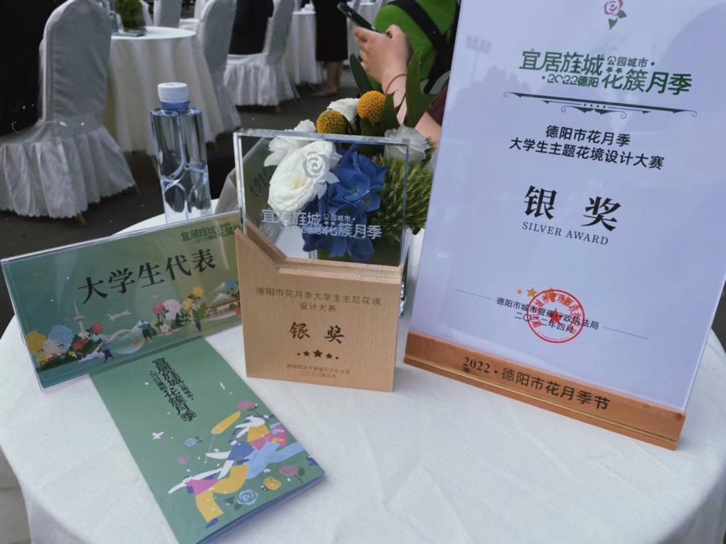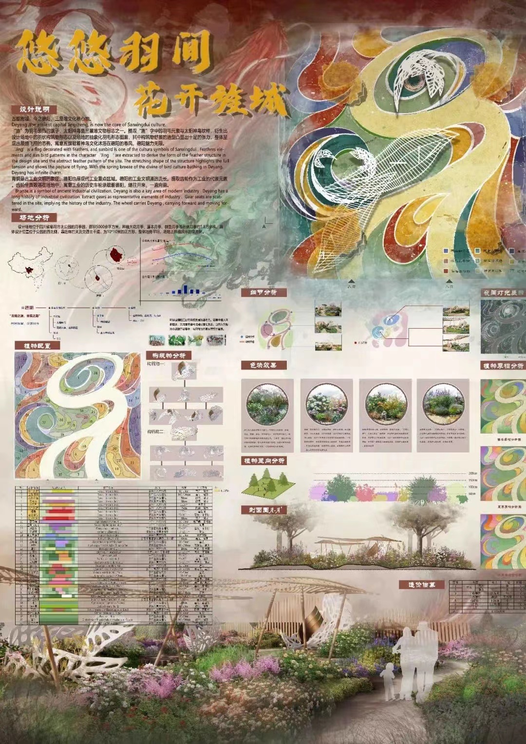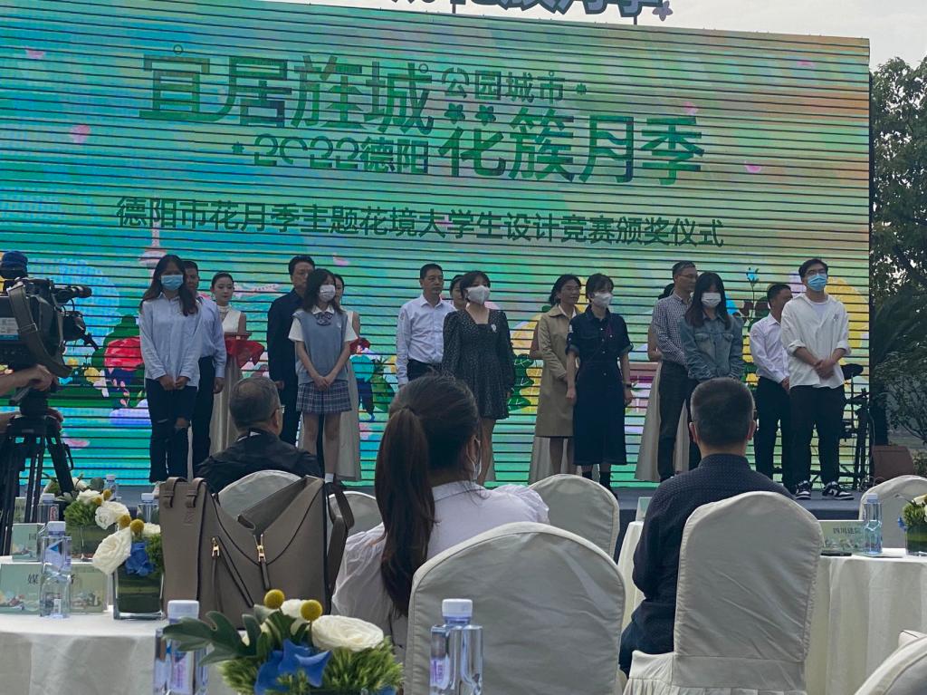 公司风景园林本科学子刘欣雨,杨鹏程,封明霞,张心贝,商瑾倩,在蔡仕珍老师的指导下,参加“2022德阳·市花月季节老员工花境大赛”。自2022年3月1日收到方案征集通知以来,团队在满课的学习状况下,充分利于课余时间,见缝插针,积极准备,挑灯夜战,完成并于3月29日向主办方提交了“悠悠羽间 花开旌城”设计方案。方案经过风景园林行业的知名高校和设计机构的专家评审,从国内高校92个有效设计方案,400余名学子参加的竞赛中成功入围10佳方案,其中入围10佳的团队只有2个本科生团队,其余8个都是研究生团队。并进入落地建造阶段。在施工过程中,团队克服受工程经费限制、场地现状制约、花镜材料调整以及施工协调等诸多困难,充分发挥主观能动性,通过自制材料、现场调整等途径,凸显表达设计主题与意境。方案在4月29日施工状况现场评审得到好评,与国内高校研究生团队同台竞技,斩获银奖。