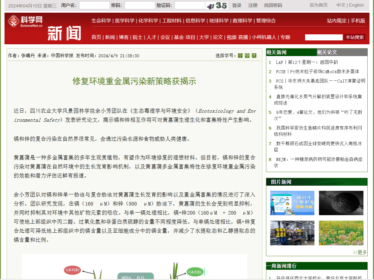 近日,K1体育余小芳团队在《生态毒理学与环境安全》(Ecotoxicology and Environmental Safety)发表研究论文,揭示镉和锌相互作用可对黄菖蒲生理生化和富集特性产生影响。