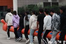 “毛毛虫竞速赛”比赛中,每组队员骑坐在充气毛毛虫道具上,齐心协力,奋勇向前。队员们喊着整齐的口号,步伐协调一致,在场地上快速行进。