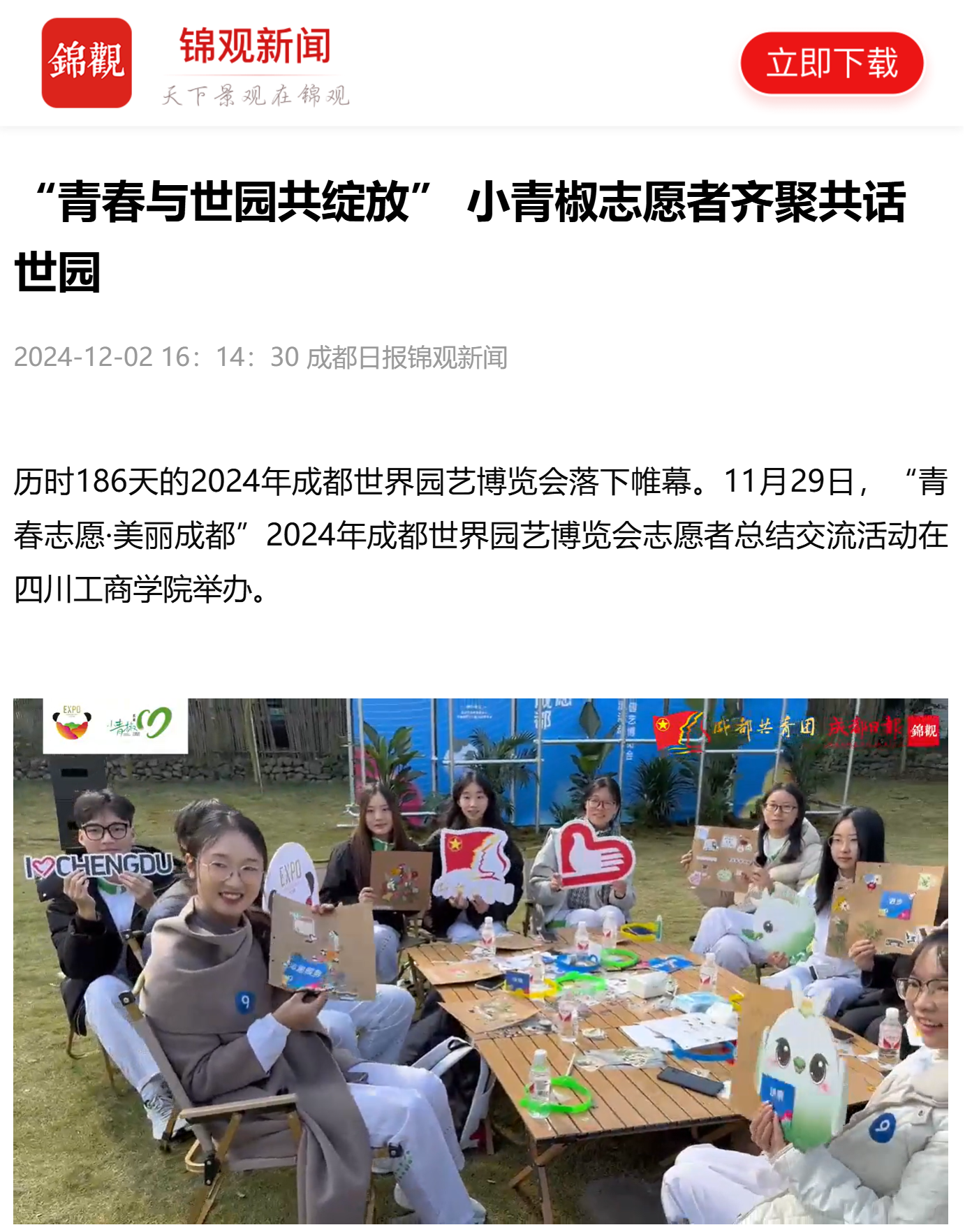 历时186天的2024年成都世界园艺博览会落下帷幕。11月29日,“青春志愿·美丽成都”2024年成都世界园艺博览会志愿者总结交流活动在四川工商公司举办。