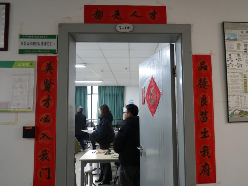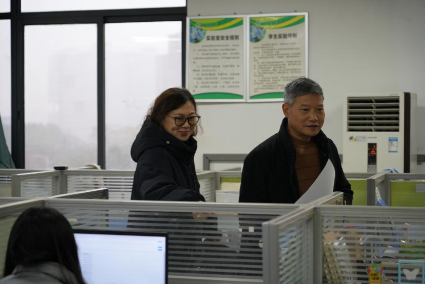 自习室内研究生代表向老师们详细介绍各自习室的创意装饰。只见进门处,一副副对仗工整、笔力苍劲的对联跃然墙上,时刻鼓舞着同学们奋勇向前;曾经堆积如山的杂物也已不见踪影,取而代之的是整洁有序的空间布局。目光流转,桌面上错落有致地摆放着生机盎然的绿植,为紧张的学习氛围注入了一抹清新自然的气息,而一旁静静陈列的科研实践成果,则见证着同学们在学术道路上的辛勤耕耘与智慧结晶。再看研究生们的工位,更是各具特色,照片墙、装饰画、励志摆件… …同学们依照自己的喜好,对这片小小的天地进行了精心装扮,无不彰显出同学们对学习生活的热爱,以及对打造一个温馨舒适、富有创意的自习室环境的用心。