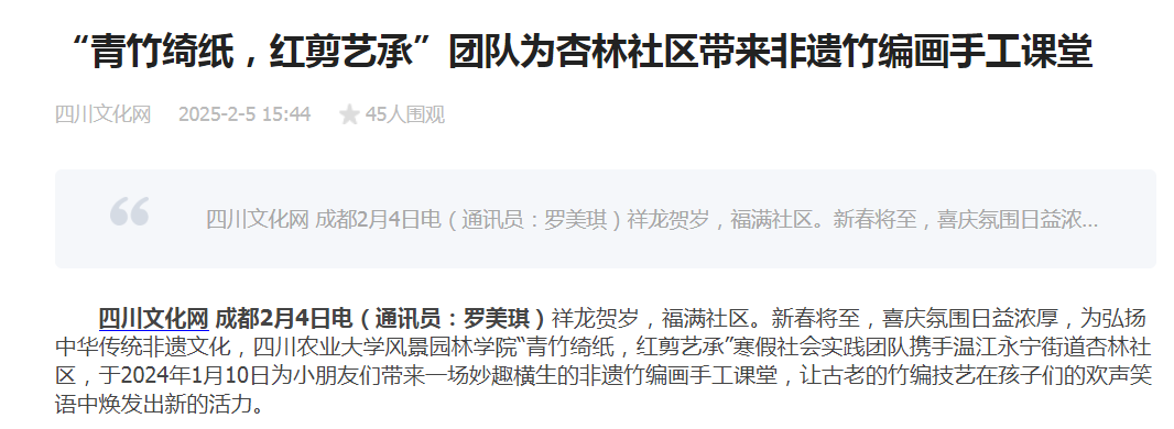 四川文化网 成都2月4日电(通讯员:罗美琪)祥龙贺岁,福满社区。新春将至,喜庆氛围日益浓厚,为弘扬中华传统非遗文化,K1体育“青竹绮纸,红剪艺承”寒假社会实践团队携手温江永宁街道杏林社区,于2024年1月10日为小朋友们带来一场妙趣横生的非遗竹编画手工课堂,让古老的竹编技艺在孩子们的欢声笑语中焕发出新的活力。