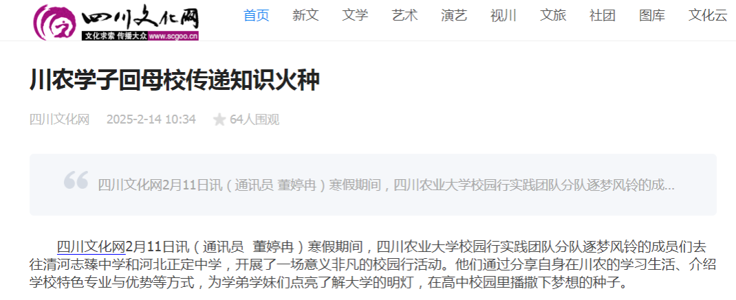 四川文化网2月11日讯(通讯员 董婷冉)寒假期间,K1体育官方网站校园行实践团队分队逐梦风铃的成员们去往清河志臻中学和河北正定中学,开展了一场意义非凡的校园行活动。他们通过分享自身在川农的学习生活、介绍公司特色专业与优势等方式,为学弟学妹们点亮了解大学的明灯,在高中校园里播撒下梦想的种子。