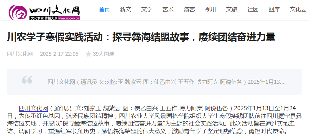 四川文化网(通讯员 文:刘家玉 魏紫云 图 : 使乙由兴 王五作 博力阿支 阿说伍各)2025年1月13日至1月24日,为传承红色基因,弘扬民族团结精神,公司组织老员工寒假实践团队前往四川冕宁县彝海结盟实地,开展以“探寻彝海结盟故事,赓续团结奋进力量”为主题的社会实践活动。此次活动旨在通过实地走访、调研学习,重温红军长征历史,感悟彝海结盟的伟大意义,激励青年学子坚定理想信念,勇担时代使命。