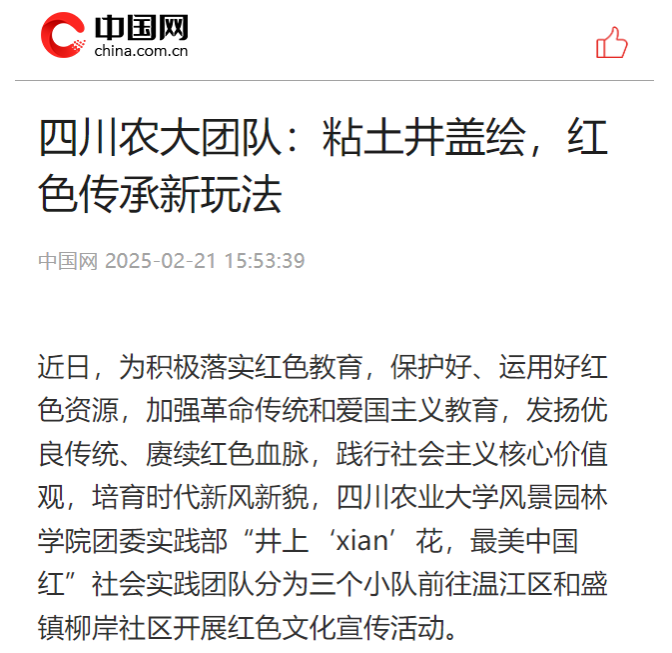 本次和盛镇红色文化宣传活动中团队成员“红色赋能,以小见大”,是在创新性宣传方式板块的具体应用。团队未来将持续开展红色文化宣传活动,加大宣传力度,呼吁更多川农学子加入红色精神宣传行列,赓续红色血脉、创新宣传方式、丰富红色精神宣传活动形式、助力红色精神赓续传承。