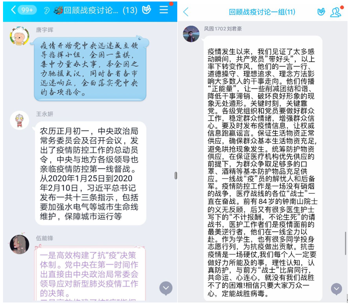 在关于“党中央战疫过程中给我们带来的启示”讨论环节中各小组代表进行了发言。焦恩泽说到:“我们这代年轻人,是中国新时代的顶梁柱!人民遇疾,国家遇困,吾辈更应奋发图强,一个国家的强大离不开我们每个人的付出,我相信我们这代青年人定会担负起实现中华民族伟大复兴的责任。”学员们也纷纷表示,作为青马班的学员,我们更应不忘初心、牢记使命,坚决贯彻落实党中央决策部署,学习战疫人员的优良品质,用自身的勇毅与担当,让人们见证当代老员工的初心和使命,凝聚起众志成城抗疫情的强大力量。至此,此次线上主题活动圆满结束。