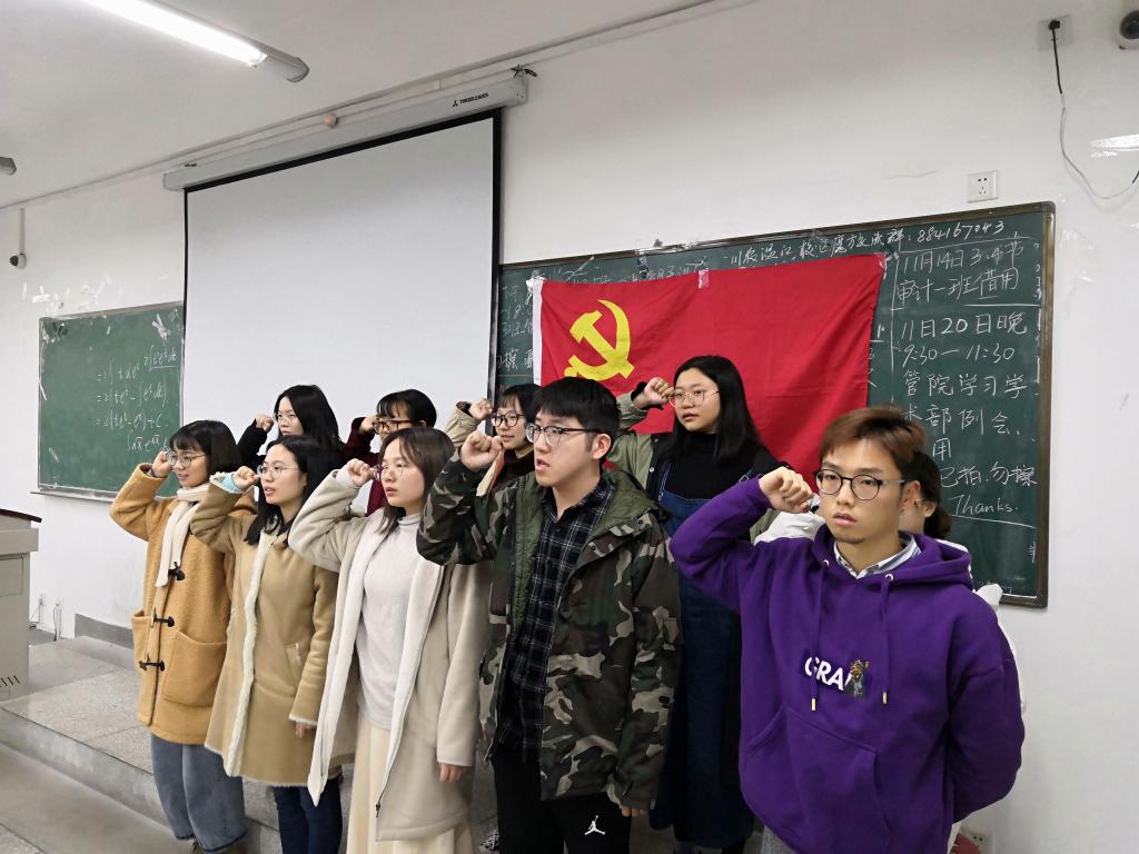 紧接着,全体发展党员进行了庄严的入党宣誓。他们整齐排列在党旗前,高举右拳,神情肃穆,大声跟读着入党宣誓词。从这庄严的宣誓词中,他们感受到了一个共产党人的使命,了解到了党的义务,体会到了身为一个共产党人的价值。经过这次宣誓,发展党员们都离成为正式党员更近了一步。