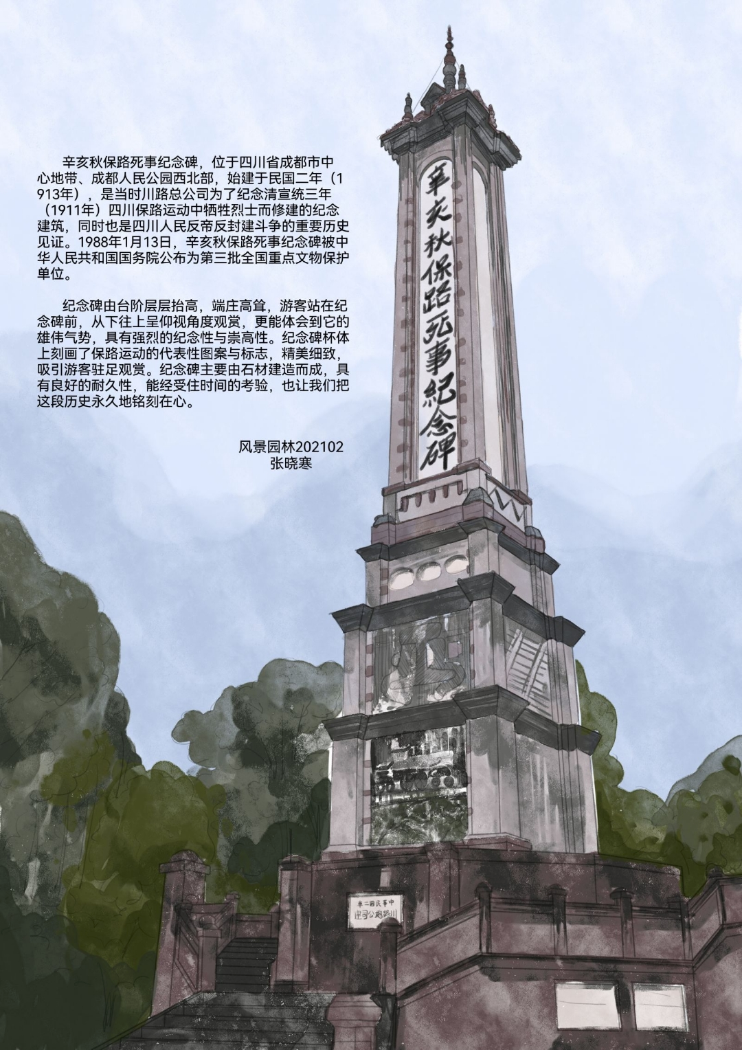 实地调研,绘制革命画卷。活动伊始,同学们步入人民公园,聚焦“分析人民公园中的景观环境对烘托革命情怀起到的作用”这一课题,分组讨论、充分交流,对公园内的景观节点展开细致入微的观察与分析,并对各自喜爱的景观节点进行写生。在与景物的“对话”中,大家深入领悟了园林艺术与革命精神的交融之道。一笔一划间,革命先辈们不屈不挠、英勇斗争的形象跃然纸上,激励着青年学子们以更加昂扬的斗志,投身于专业学习与实践的浪潮中。