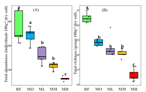 图1示:随人为干扰强度增加,线虫个体密度(A)及类群丰富度(B)急剧下降