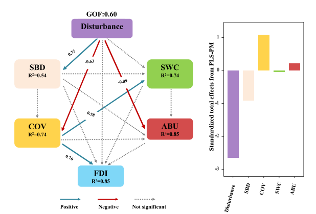 图3示:揭示人为践踏干扰影响线虫群落多样性(FDI、ABU)的机制