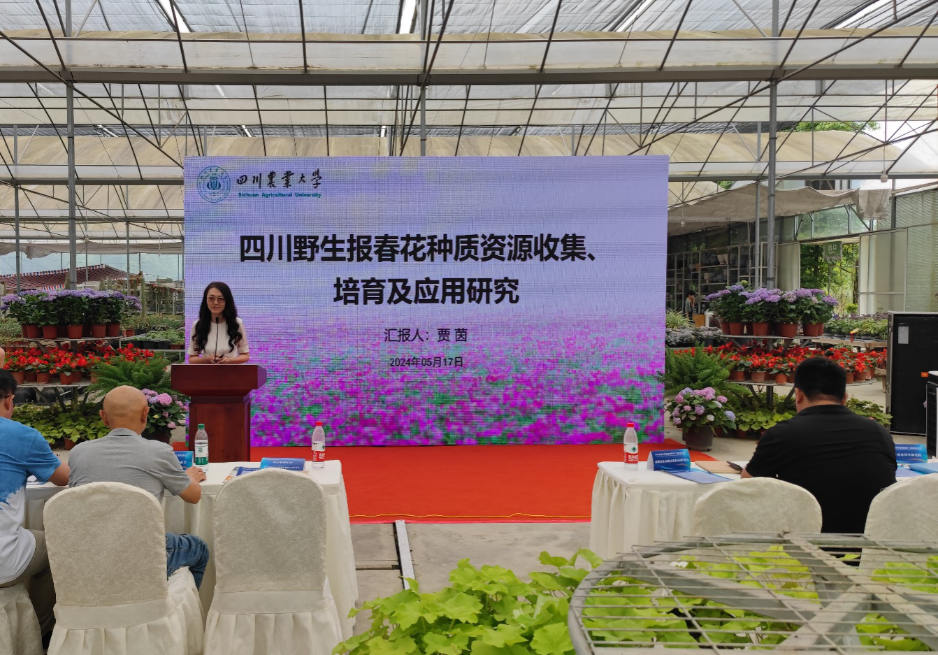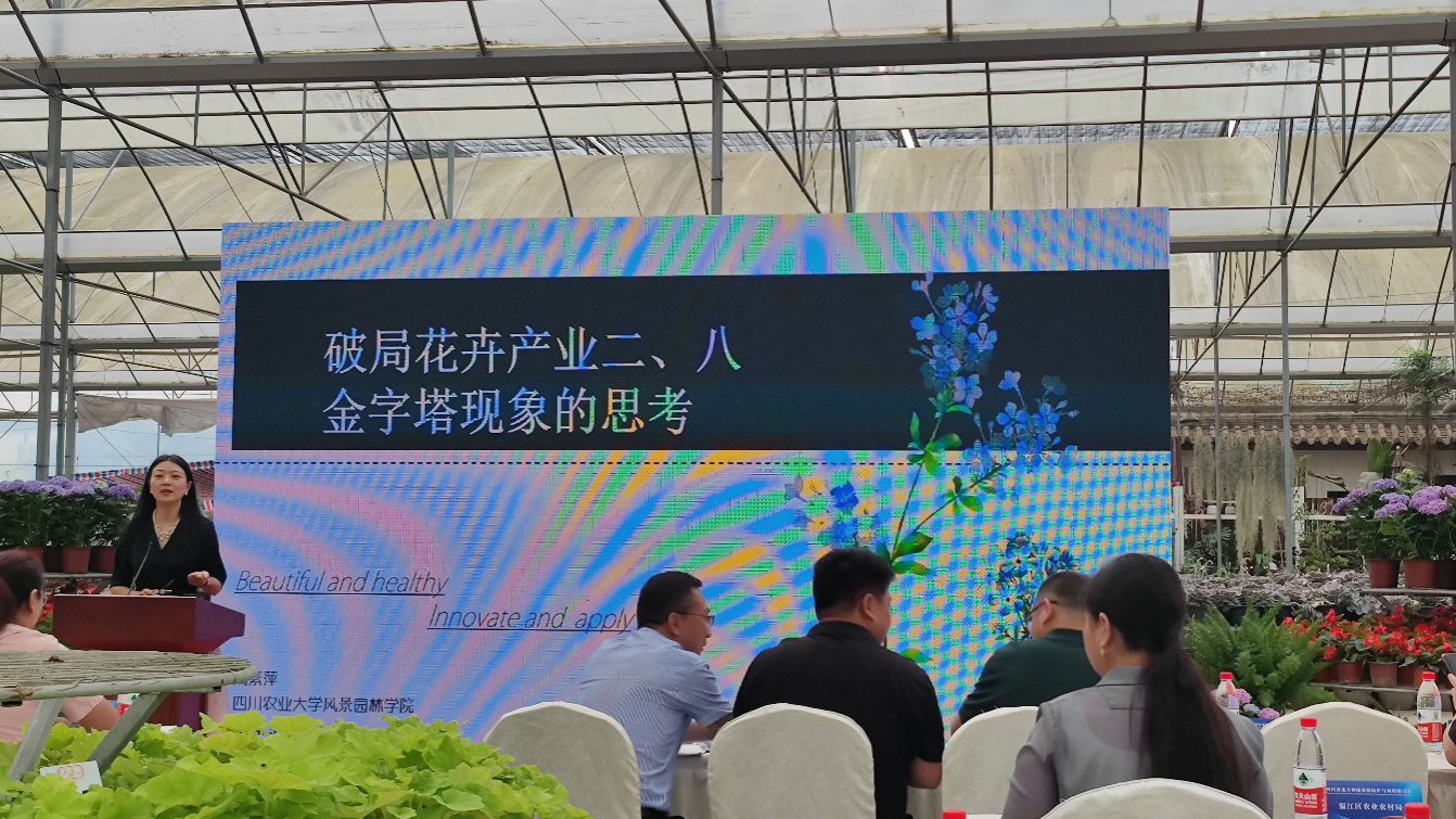 本次研讨会由四川省林学会花卉与风景园林专委会和成都市温江区和盛镇人民政府联合主办。会议以“四川省花卉种质资源保护与利用”为主题,旨在促进花卉种质资源的保护和选育,推动我省花卉产业的高质量发展。高素萍教授和贾茵教授分别作题为《破局花卉产业二、八金字塔现象的思考》《四川野生报春花种质资源收集、培育及应用研究》的主题报告,报告围绕花卉育种研发、花卉新品种保护、花卉新优品种推广、花卉成品应用等方面进行了深入的探讨,为我省花卉品种创新与新品种应用提供了重要参考。青年教师雷霆博士参加了大会主题研讨。