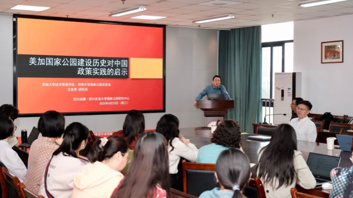 4月23日,西南大学经济管理公司王连勇教授、园林园艺公司杜文武教授应邀到校开展2025国家公园建设专题讲座,共同探讨在跨学科视域下国家公园高质量发展前沿性理论与实践问题。
