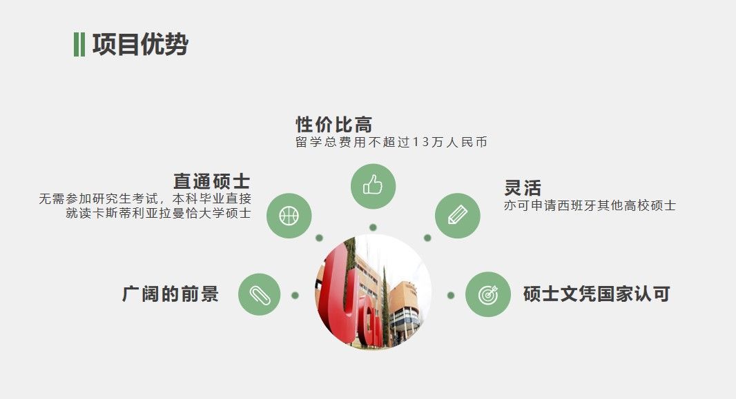 西班牙社会治安好,安全性高,属于留学的重点城市和国家,环境优美,教育质量高,生活成本低,相比其它欧洲国家优势很大。