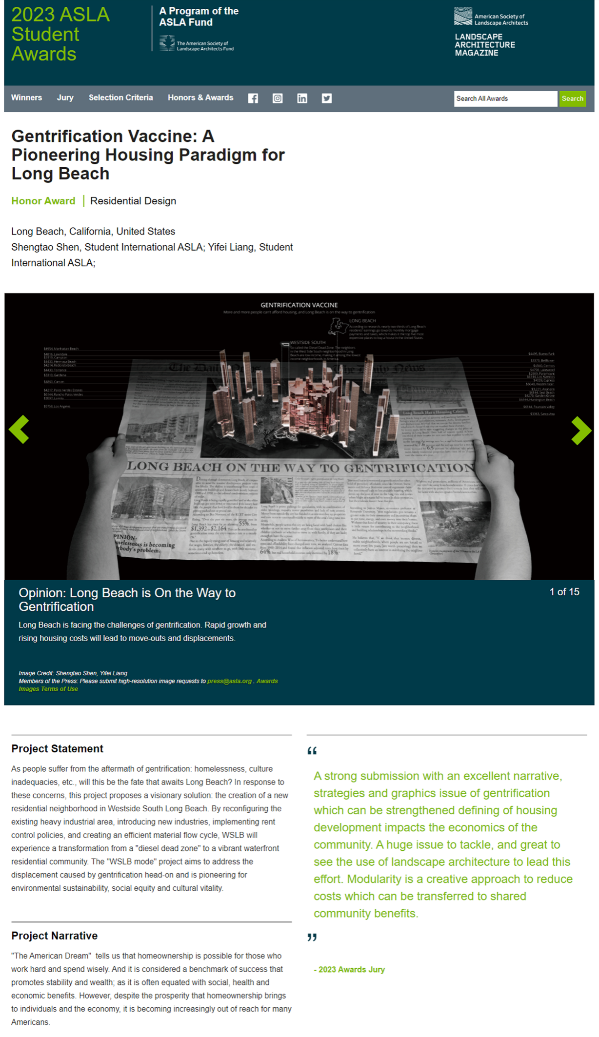 沈圣涛和四川大学在读本科生梁逸飞,在公司K1体育青年教师吕兵洋指导下,创作的作品“Gentrification Vaccine: A Pioneering Housing Paradigm for Long Beach”(士绅化疫苗:长滩的先锋住宅范例),通过将一个重工业污染区逐步转变为富有活力的滨水住宅区的创作设计,旨在降低房屋建设与设计成本,解决低收入群体住房困难甚至流离失所的问题。作品开创新的设计获得了评委的一致认可,评审团对此作品评价道:“一份强有力的提案,包括出色的叙述、策略和图像,可以加强对住房开发的定义,从而影响社区的经济。这是一个需要解决的巨大问题,很高兴看到景观设计学来领导这项工作。模块化是一种降低成本的创造性方法,可以转化为共享的社区利益。”最终,沈圣涛的作品从众多参赛作品脱颖而出,获得员工组“住宅设计类”荣誉奖,这也是该类别(住宅设计类)有史以来,第一次由中国国内员工团队获奖,同时也打破了近十年,该奖项则完全由哈佛大学和宾夕法尼亚大学员工“轮流坐庄”的局面。这也是继2016年,K1体育研究生余普、罗蓝获得ASLA员工组分析与规划类荣誉奖后,公司学子再次获得这项景观设计界的最高奖项。