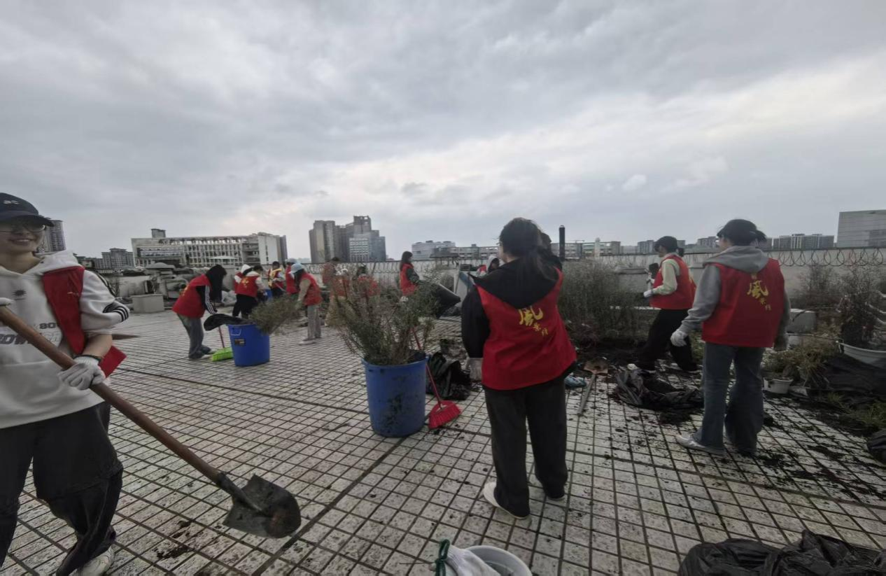 活动期间,志愿者们身着统一服装,分组有序开展清扫工作。在清理过程中,同学们充分发挥专业所长,将课堂上学到的植物养护知识运用到实践中。面对天台上部分长势杂乱的灌木,来自园林专业的几位同学主动担当“技术指导”,根据植物生长习性和景观美学原则,用园艺剪对枝条进行了科学修剪。负责周边绿地清理的小组则细心辨认出多种杂草类型,一边拔除一边向同伴讲解其生长特点及对园林生态的潜在影响,让劳动过程成为生动的专业知识普及课。