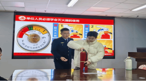 在灭火器使用教学环节,罗涛教官讲解了灭火器的使用方法,根据“提,拨,握,压”的四大要领,给在场师生进行演示,并让同学在指导下体验灭火器的正确使用方法,根据同学的实操表现,对灭火器使用的操作细节进行更加细致的讲解与示范。