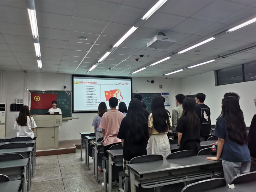 首先,我们在文娱委员的带领下齐唱团歌,让歌声引领我们走进爱党爱团的学习氛围。