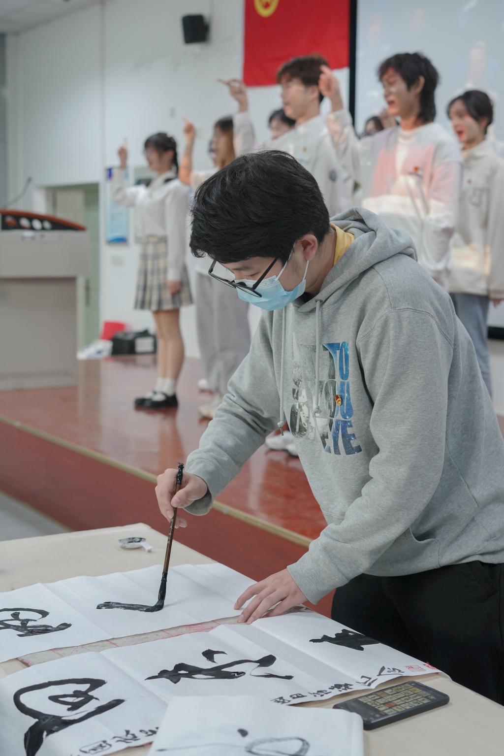 活动最后,K1体育啦啦队带来“一起向未来”手势舞表演,同时林公司书画队成员展示其主题的书法作品,共同合作完成表演。