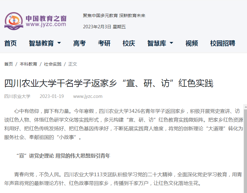 传承红色文化,赓续红色血脉。川农青年以党的二十大精神为指引,积极开展“返家乡”社会实践,深入基层一线,着力做好党的创新理论青年化阐释,在实践的道路上不断坚定理想信念、厚植红色基因,用青年之音歌颂红色故事,让红色文化真正地落地生花,为红色精神薪火相传贡献青年力量。