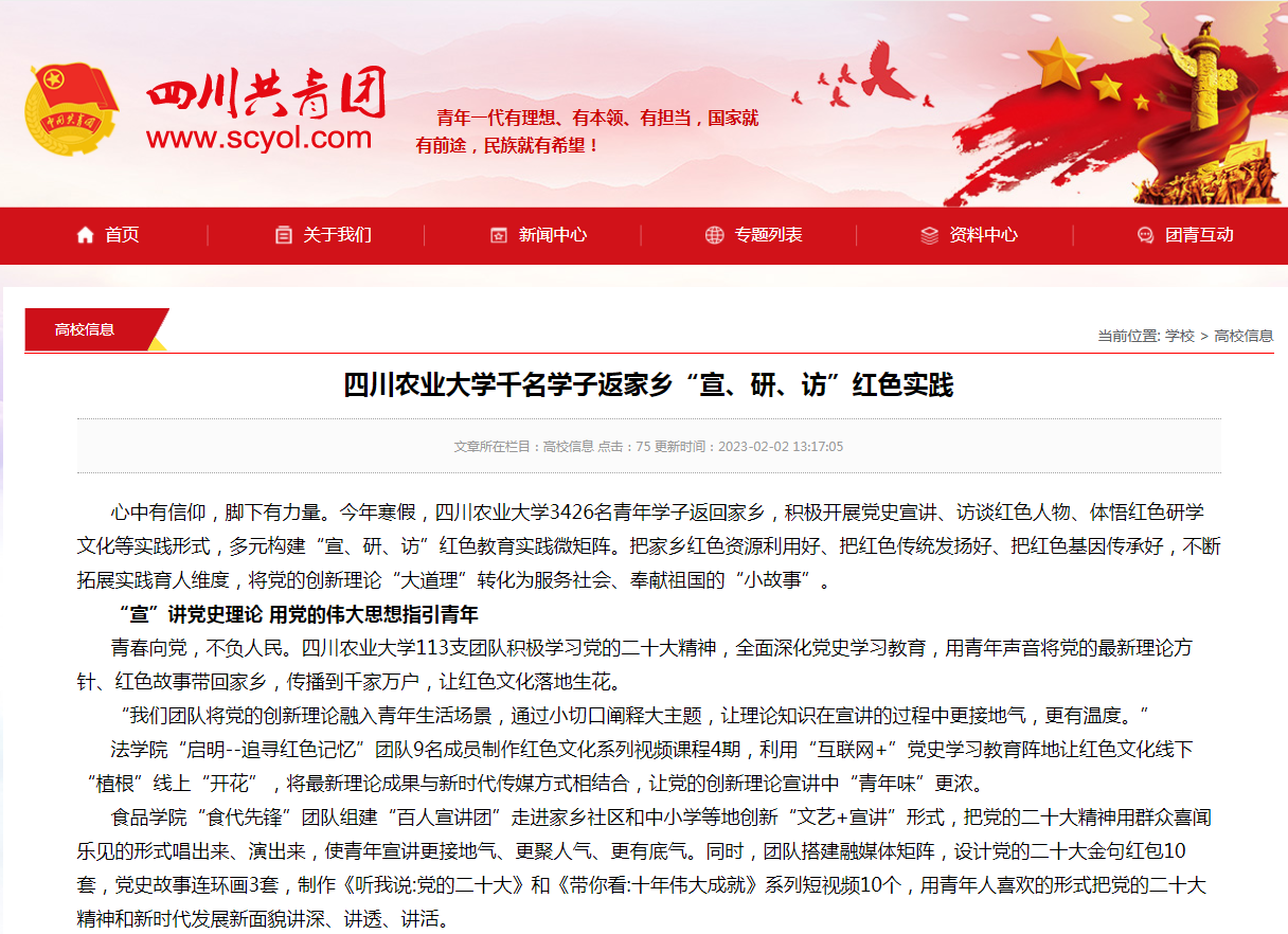 传承红色文化,赓续红色血脉。川农青年以党的二十大精神为指引,积极开展“返家乡”社会实践,深入基层一线,着力做好党的创新理论青年化阐释,在实践的道路上不断坚定理想信念、厚植红色基因,用青年之音歌颂红色故事,让红色文化真正地落地生花,为红色精神薪火相传贡献青年力量。