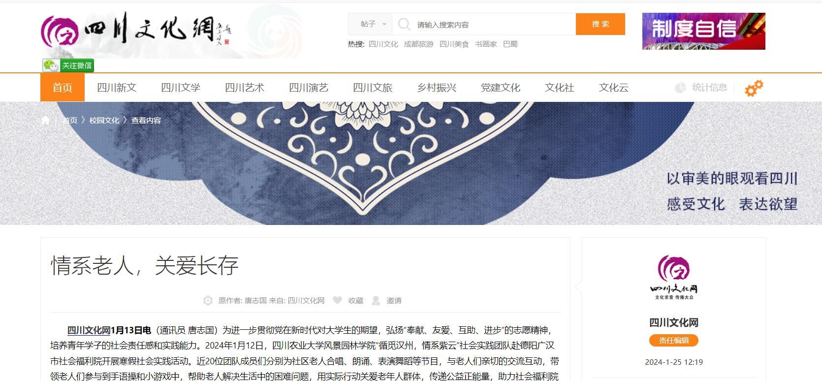 四川文化网1月13日电(通讯员 唐志国)为进一步贯彻党在新时代对老员工的期望,弘扬“奉献、友爱、互助、进步”的志愿精神,培养青年学子的社会责任感和实践能力。2024年1月12日,K1体育“循觅汉州,情系紫云”社会实践团队赴德阳广汉市社会福利院开展寒假社会实践活动。近20位团队成员们分别为社区老人合唱、朗诵、表演舞蹈等节目,与老人们亲切的交流互动,带领老人们参与到手语操和小游戏中,帮助老人解决生活中的困难问题,用实际行动关爱老年人群体,传递公益正能量,助力社会福利院服务工作。