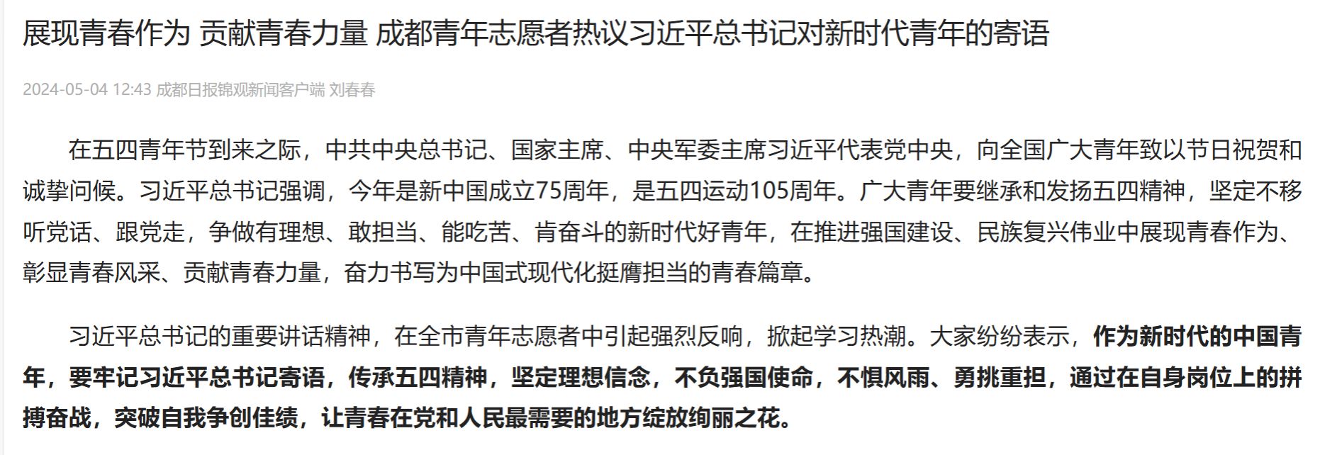 在五四青年节到来之际,中共中央总书记、国家主席、中央军委主席习近平代表党中央,向全国广大青年致以节日祝贺和诚挚问候。习近平总书记强调,今年是新中国成立75周年,是五四运动105周年。广大青年要继承和发扬五四精神,坚定不移听党话、跟党走,争做有理想、敢担当、能吃苦、肯奋斗的新时代好青年,在推进强国建设、民族复兴伟业中展现青春作为、彰显青春风采、贡献青春力量,奋力书写为中国式现代化挺膺担当的青春篇章。