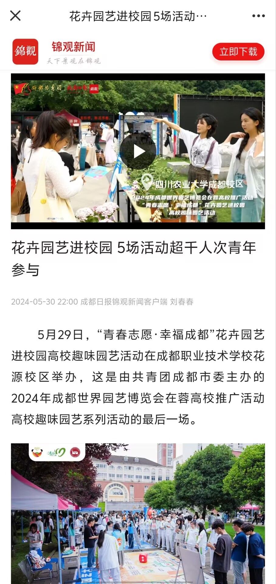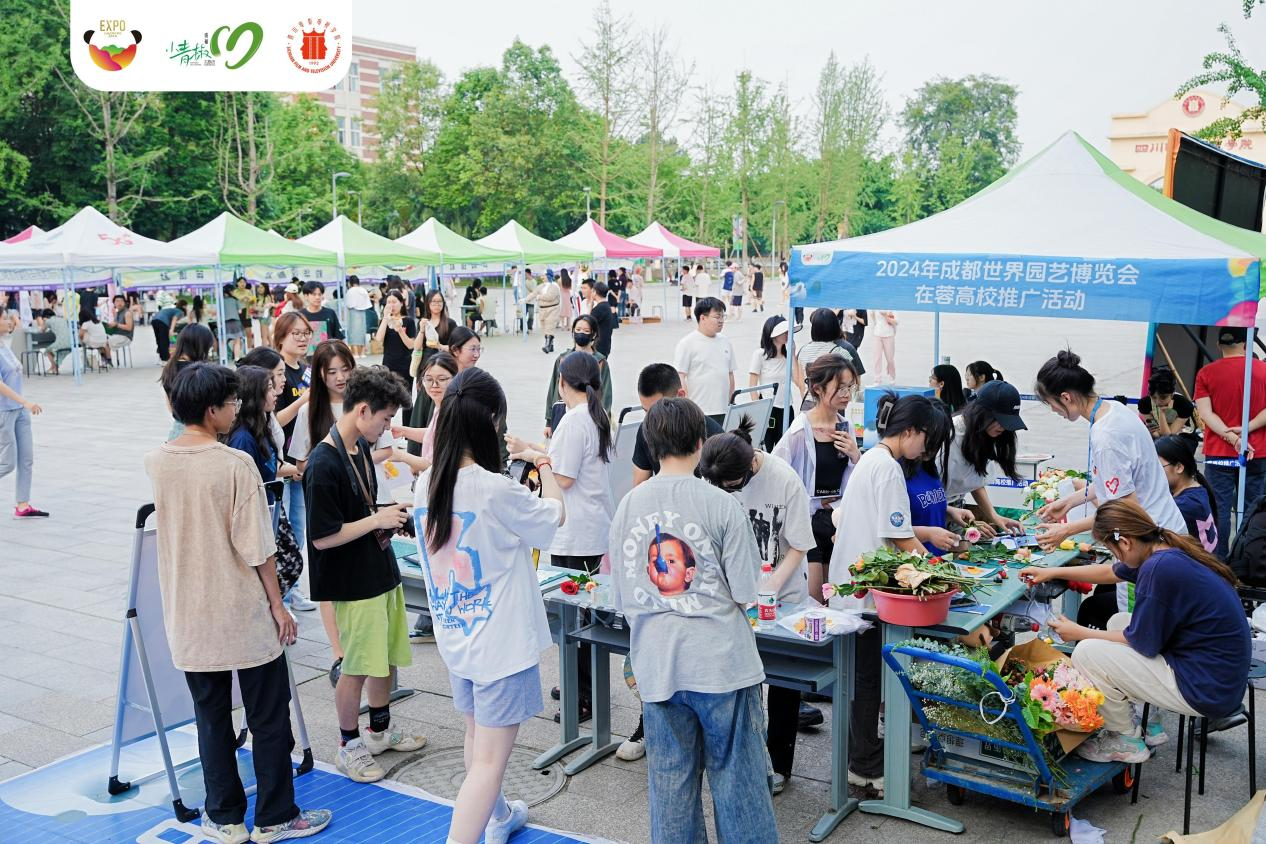 4月20日,2024成都世园会首场在蓉高校推广活动在吉利公司拉开帷幕。5月17日,“青春志愿·幸福成都”花卉园艺进校园高校趣味园艺活动在K1体育官方网站成都校区举行,特设“拾趣川花”园艺名家科普区,开展川花展示科普、茶艺表演、插花花艺体验活动。5月22日,该活动在四川电影电视公司安仁校区举行,结合公司“川流簇梦再奋进,挺膺担当立潮头”2024社团活动节暨老员工文化节,活动现场设置“敲出春意盎然”植物拓染DIY活动区,员工现场感受中国传统草木拓染的魅力。5月23日,该活动在四川工商公司举行,活动现场设置“妙手生花”非遗团扇DIY区,由高校青年充分发挥想象力和创造力,挑选自己喜爱的植物材料,制作团扇作品。
