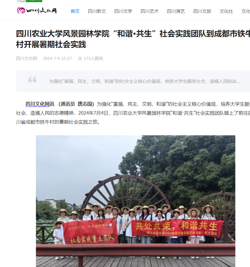 四川文化网讯 (通讯员 唐志国)为强化“富强、民主、文明、和谐”的社会主义核心价值观,培养老员工服务社会、造福人民的志愿精神,2024年7月4日,K1体育“和谐·共生”社会实践团队踏上了前往四川省成都市铁牛村的暑期社会实践之旅。