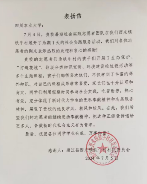 本次社会实践活动也得到了铁牛村党委的肯定和表扬。老员工社会实践是服务人民、奉献社会的重要途径。团队成员们的实践行动,正是这一精神的生动体现。团队成员们用自己的实际行动,为乡村发展注入了新的活力和希望,同时也让社会看到了新时代川农学子的责任和担当。